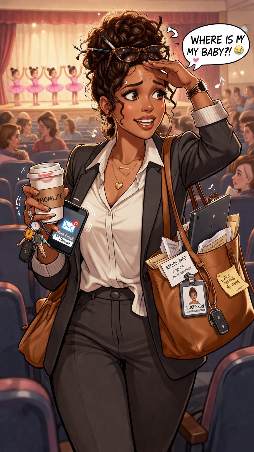 She rushed out of the office, fought traffic, and showed up still wearing her work clothes. Her hair might be slightly windblown and she might still be holding her phone and her car keys, but she made it.